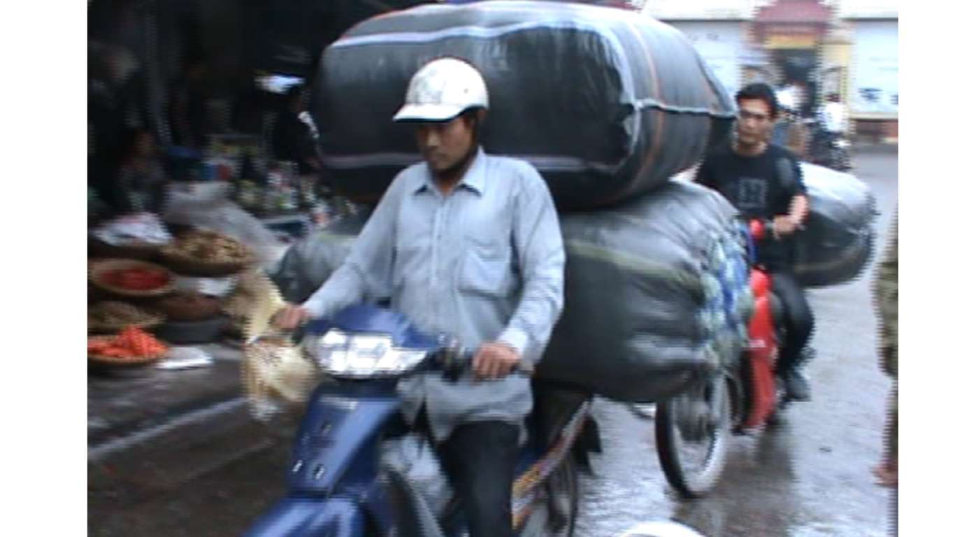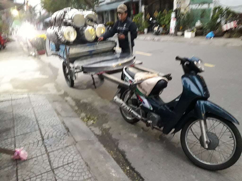Il n'y a pas de règle, on roule ou il y a de la place. Le chargement des 2 roues est impressionnant. Le macadam est en bon état.