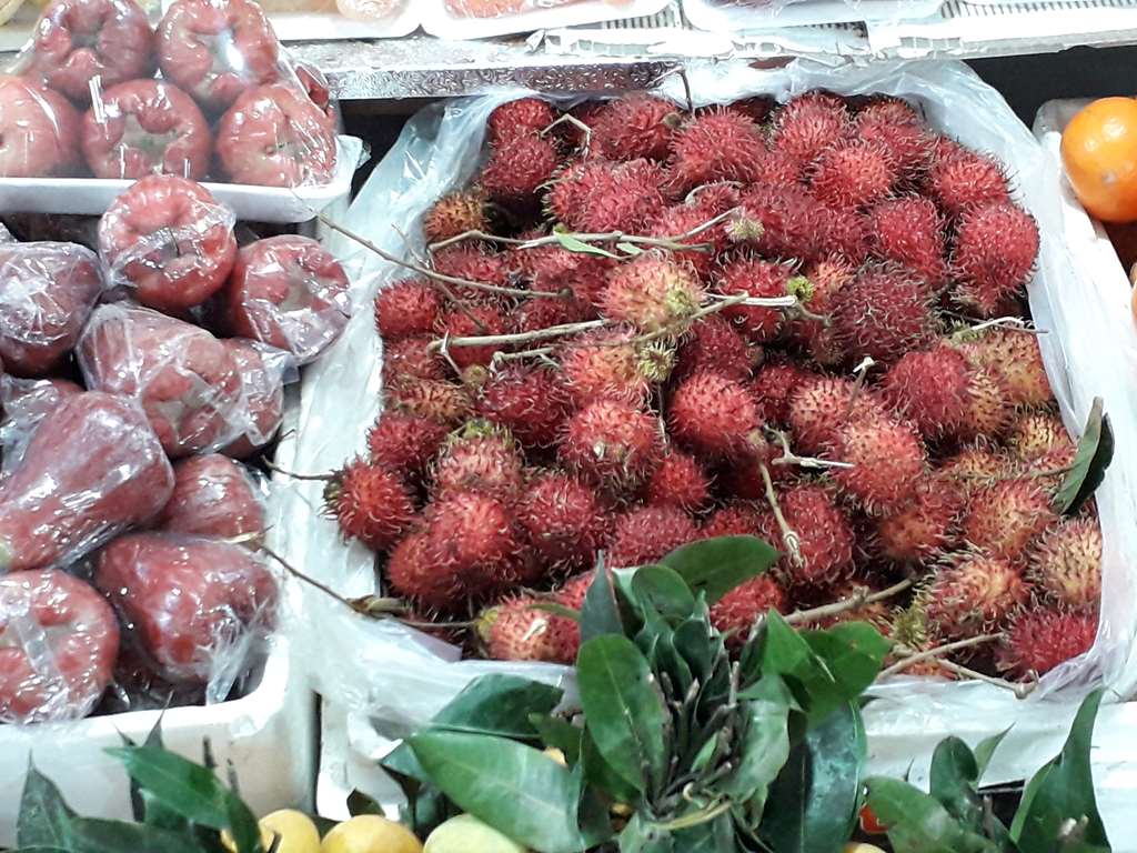 Fruits et légumes, coiffeur et machine à coudre, boucher et poissonnier.
